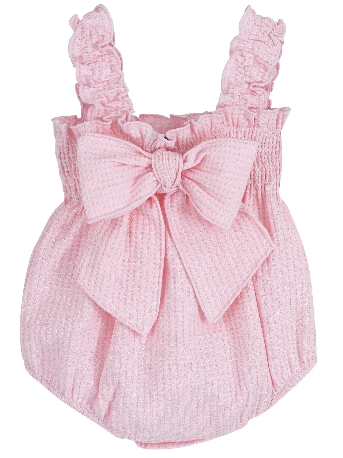 Precioso y muy cómodo peto de tirantes confeccionado en algodón elástico y labrado de muy alta calidad en color rosa, destaca por su pecho que es un nido de abeja que se ajusta perfectamente al contorno de nuestra niña, viene presentado en caja para regalo, es una prenda que tenemos dentro de nuestra colección de ropa para primera puesta recién nacido.