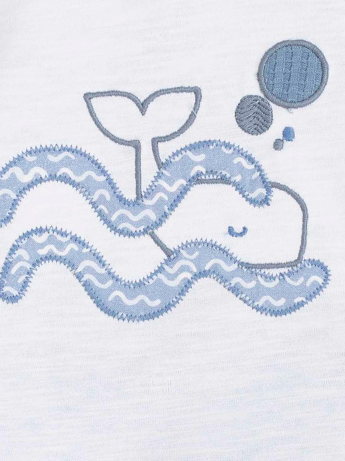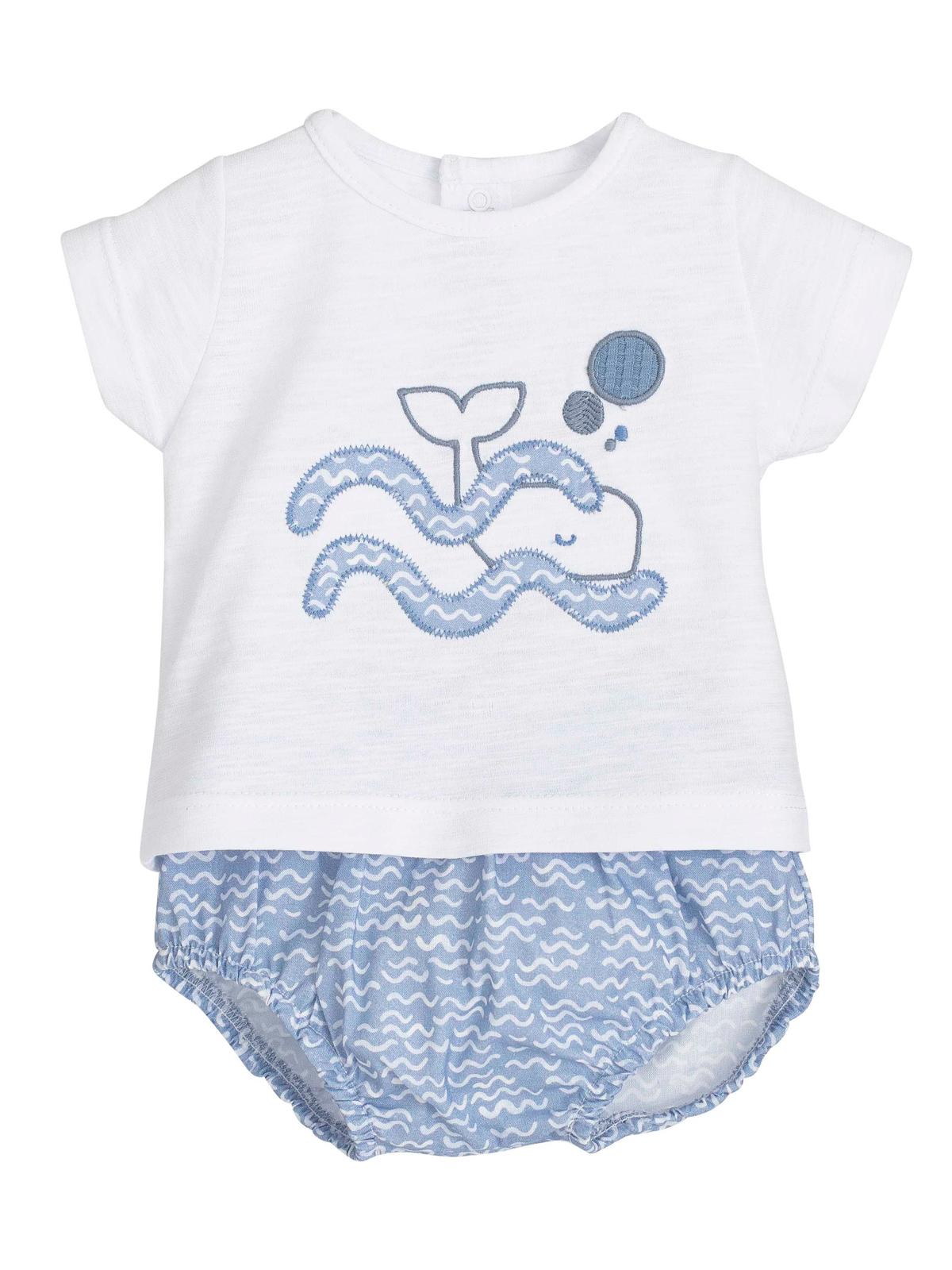 Clásico conjunto de la marca que podemos ver dentro de la colección de ropa de primera puesta, compuesto por pololo corto estampado en color azul y camiseta de manga corta con bordado decorativo de un a ballena en al mar. Viene presentado en caja para regalo.