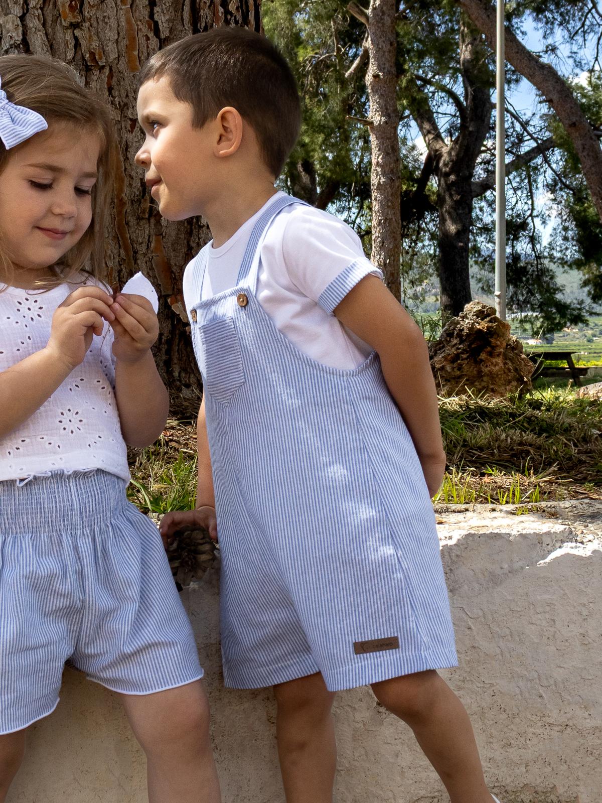 Bonito conjunto de peto corto para bebe niño de la nueva colección de ropa de Calamaro para esta primavera verano, modelo 11315 de la familia Kerala, compuesto por peto corto de rayas y camiseta de manga corta. FABRICADO EN ESPAÑA. Viene presentado en caja para regalo.