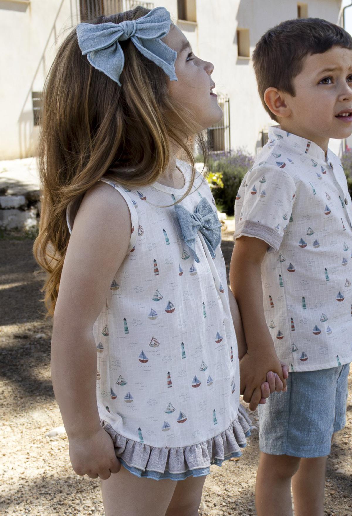 Precioso jesusito de tirantes de tirantes para niña de la nueva colección de ropa Calamaro para esta primavera verano, modelo 22118 de la familia Yanam, confeccionado en tejido estampado con barcos. FABRICADO EN ESPAÑA.