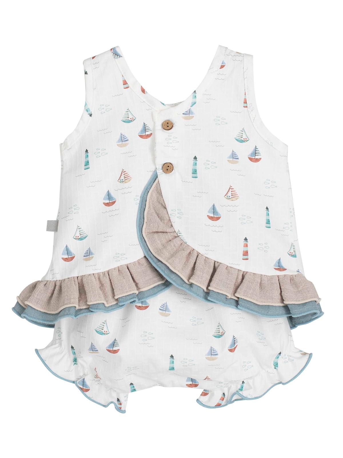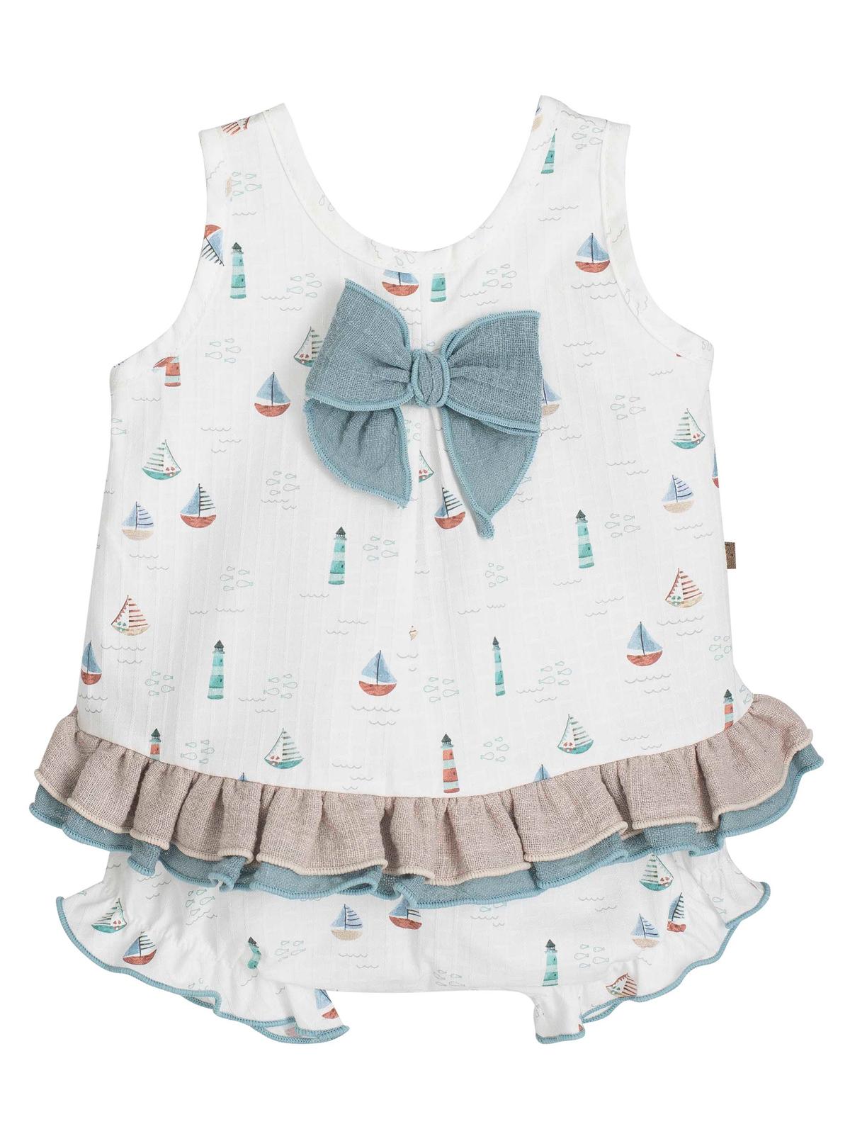 Muy bonito y cómodo jesusito con braguita de tirantes para niña confeccionado en muy original tejido estampado con barquitos tiene un lazo decorativo en el pecho y volante en el bajo, destaca por su original forma dela espalda.