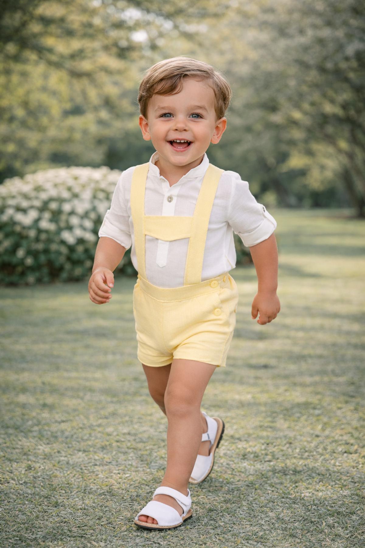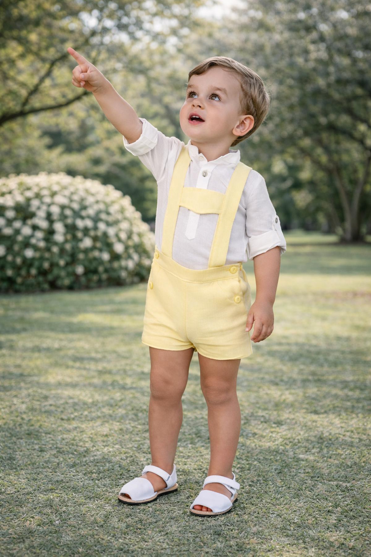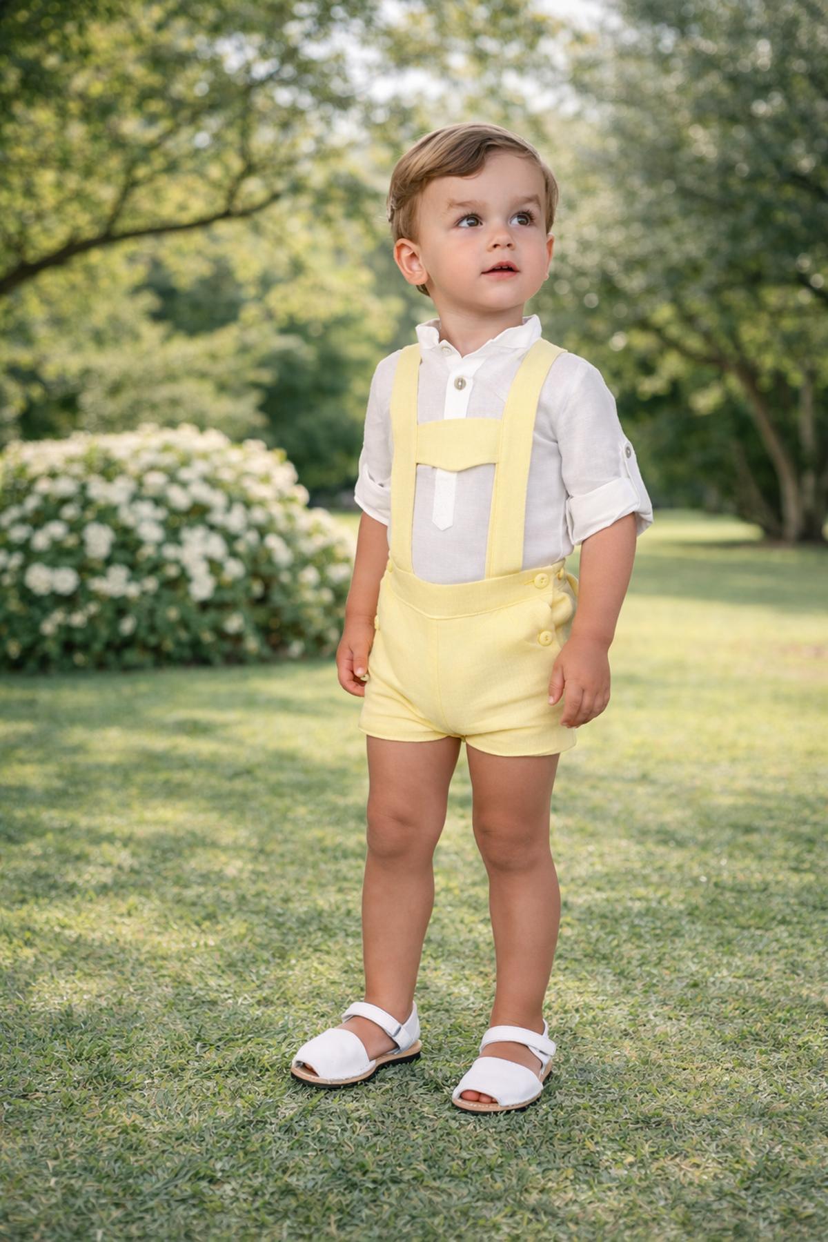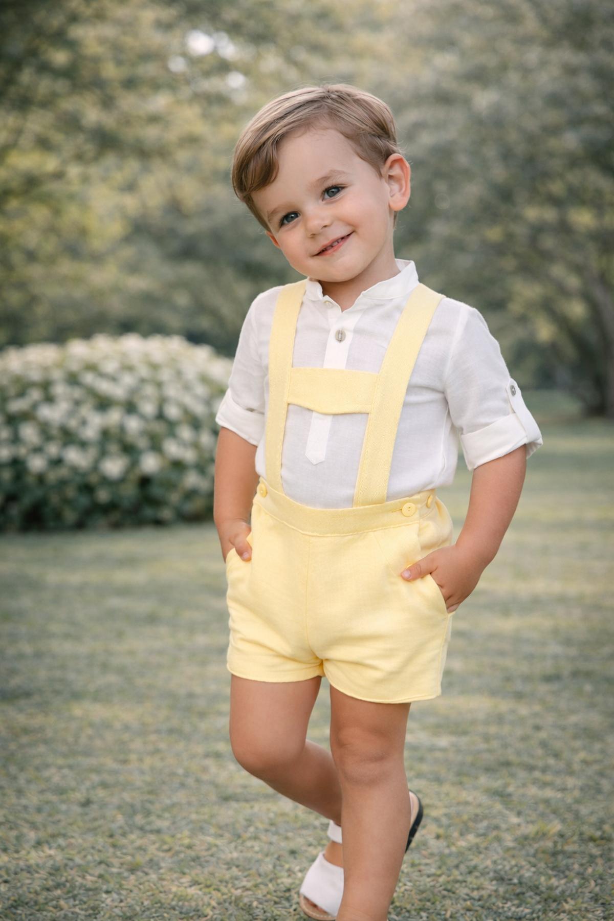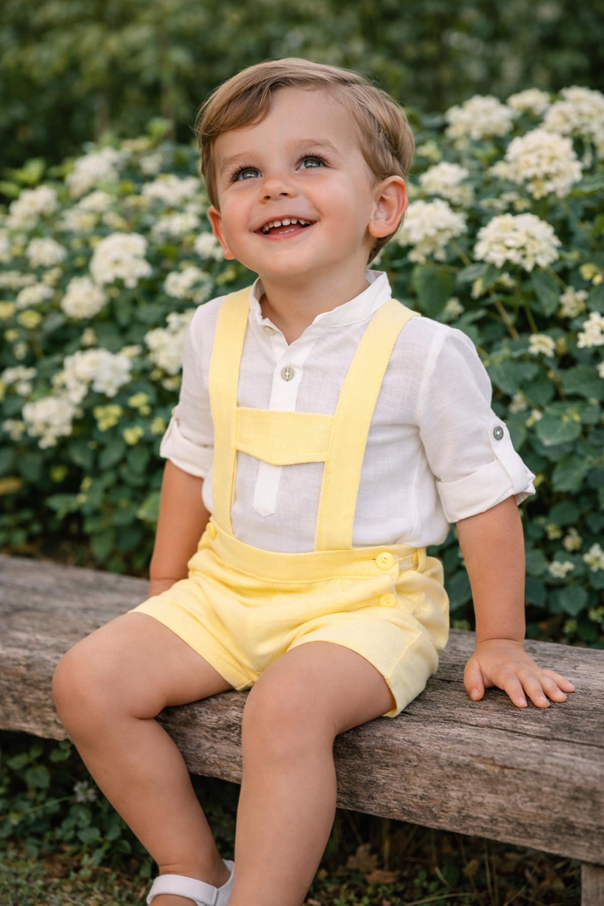 Precioso conjunto de bebe niño de la nueva colección de ceremonia Nekenia para esta primavera verano, compuesto por pantalón peto de lino color amarillo y camisa de manga larga cuello mao de lino. FABRICADO EN ESPAÑA.