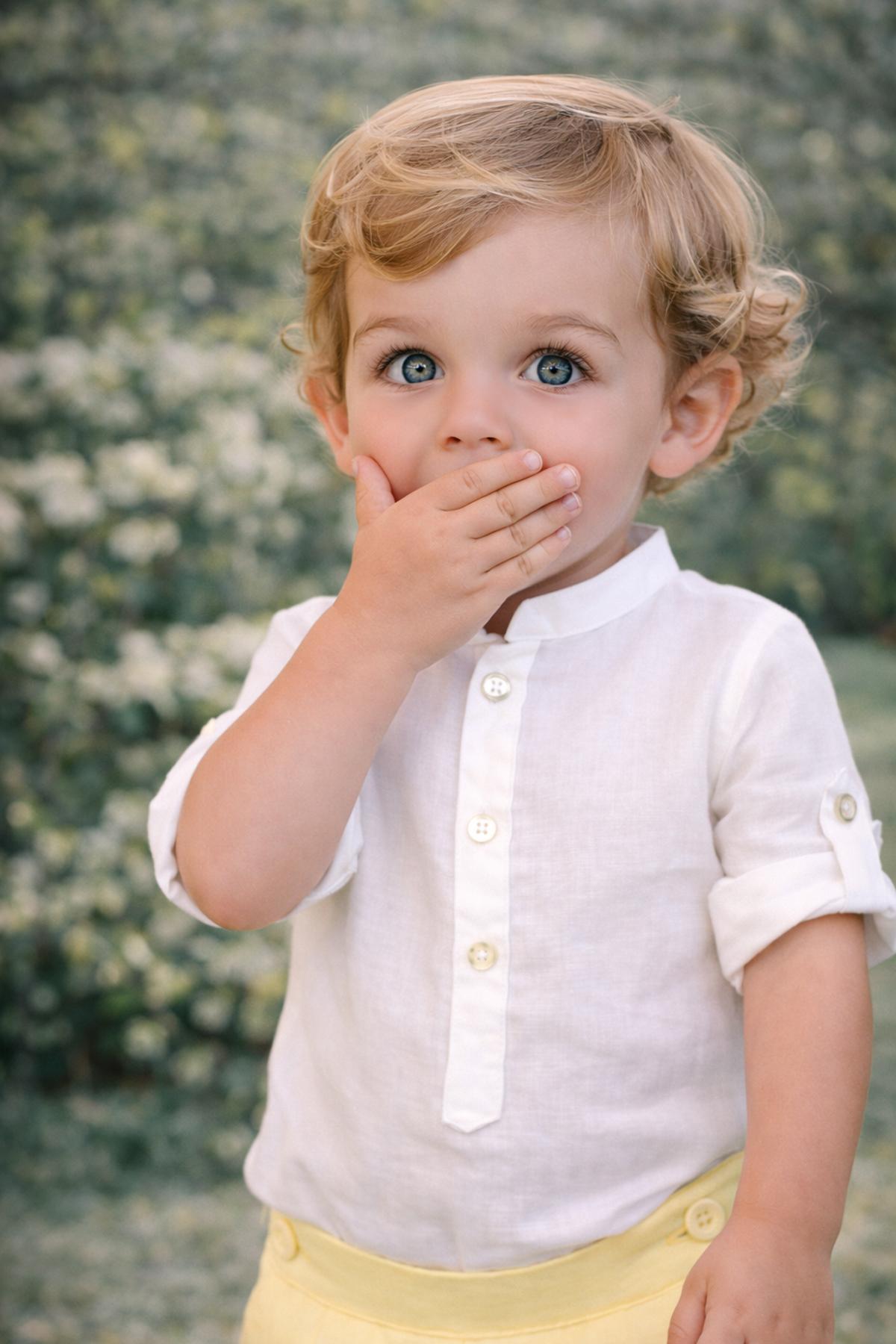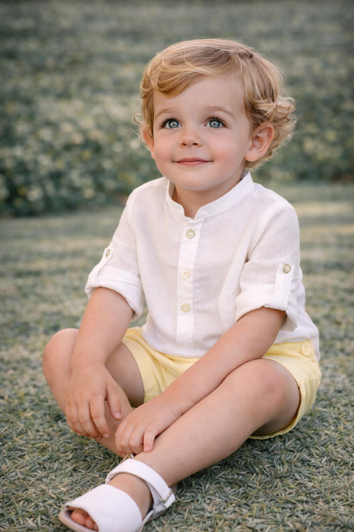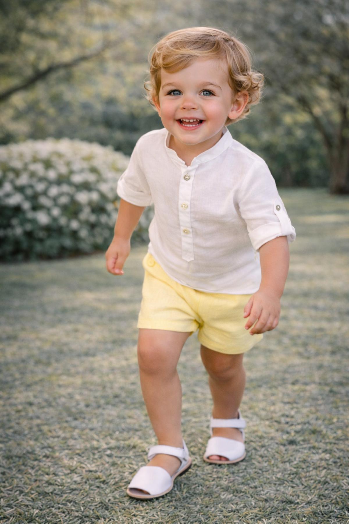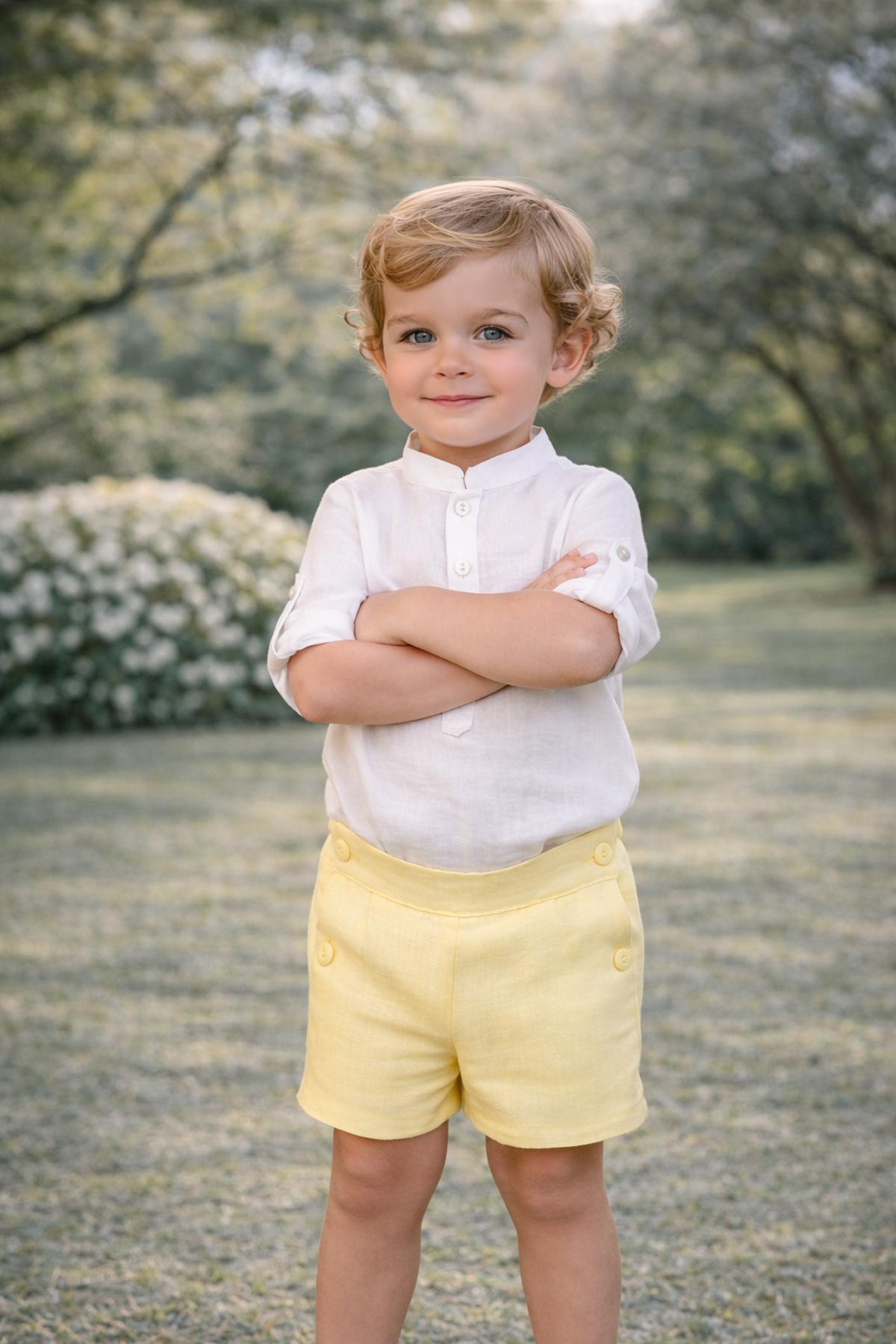 Precioso conjunto de niño de la nueva colección de ceremonia Nekenia para esta primavera verano, compuesto por pantalón corto de lino color amarillo y camisa de manga larga cuello mao de lino. FABRICADO EN ESPAÑA.