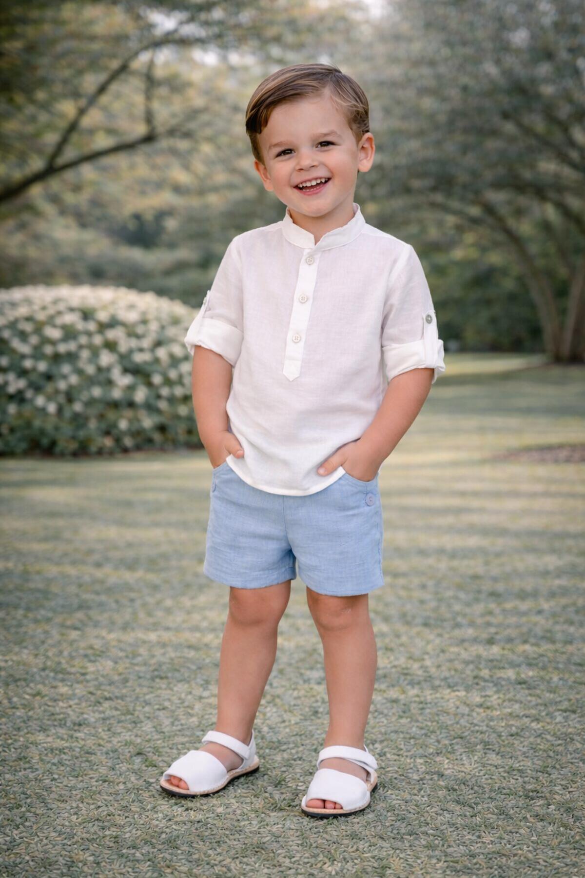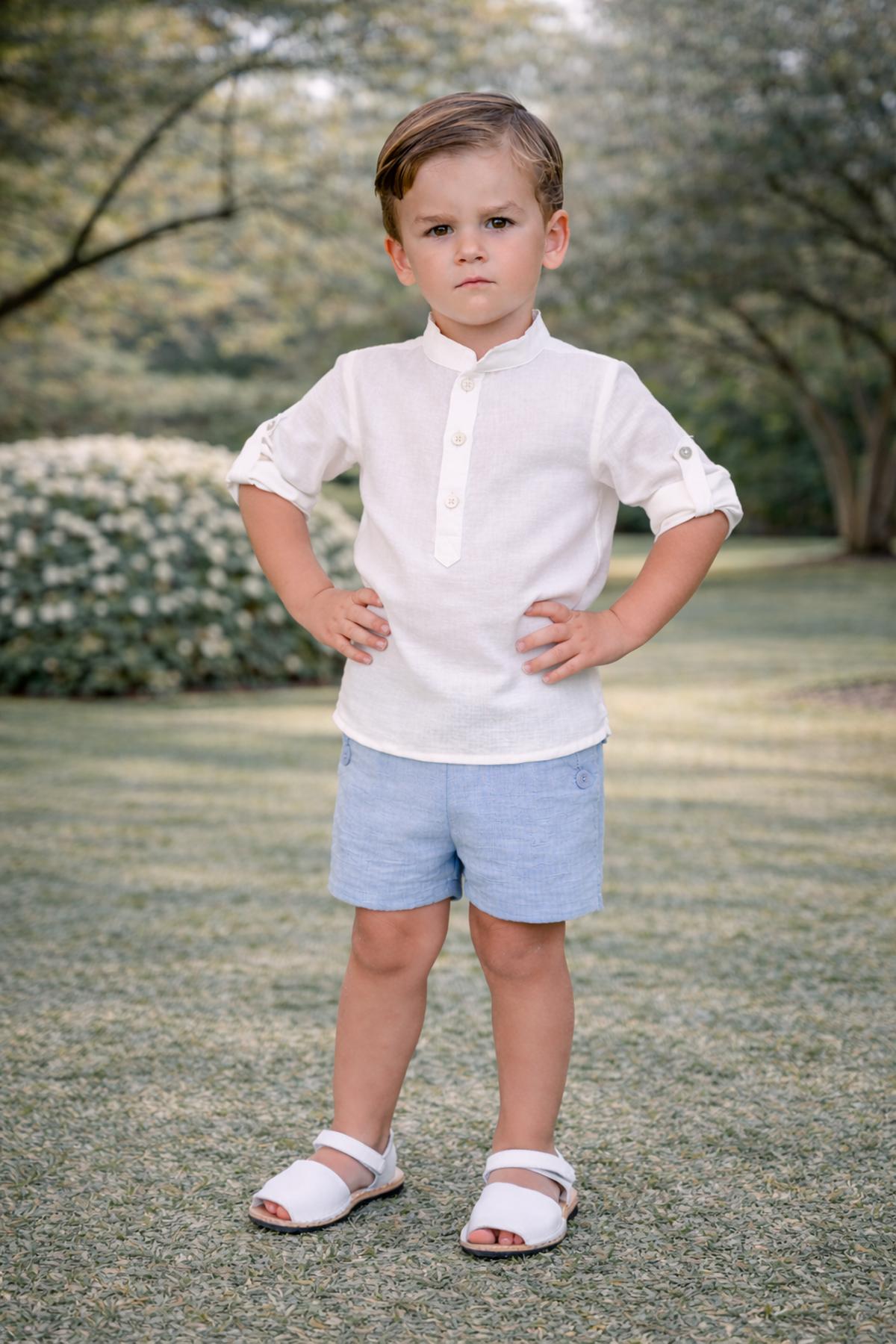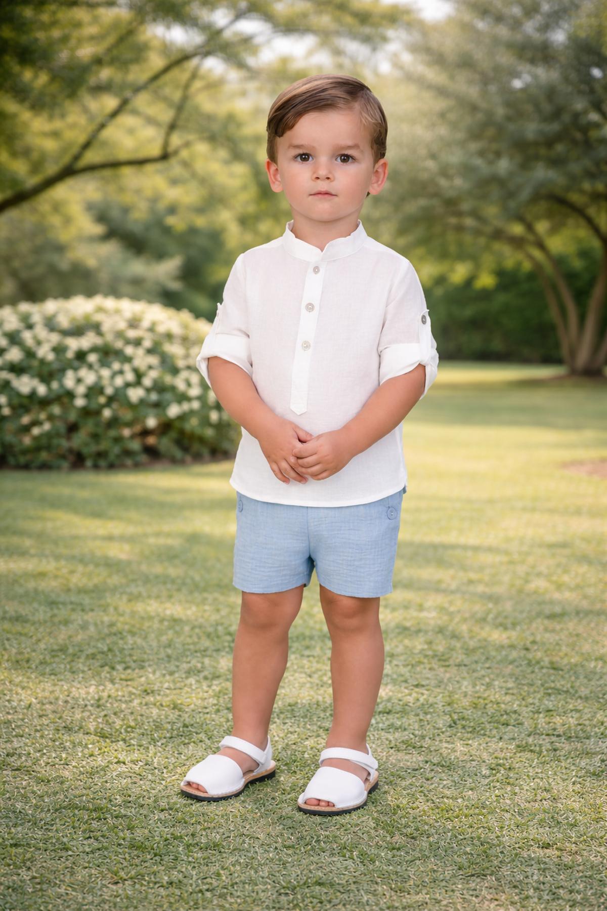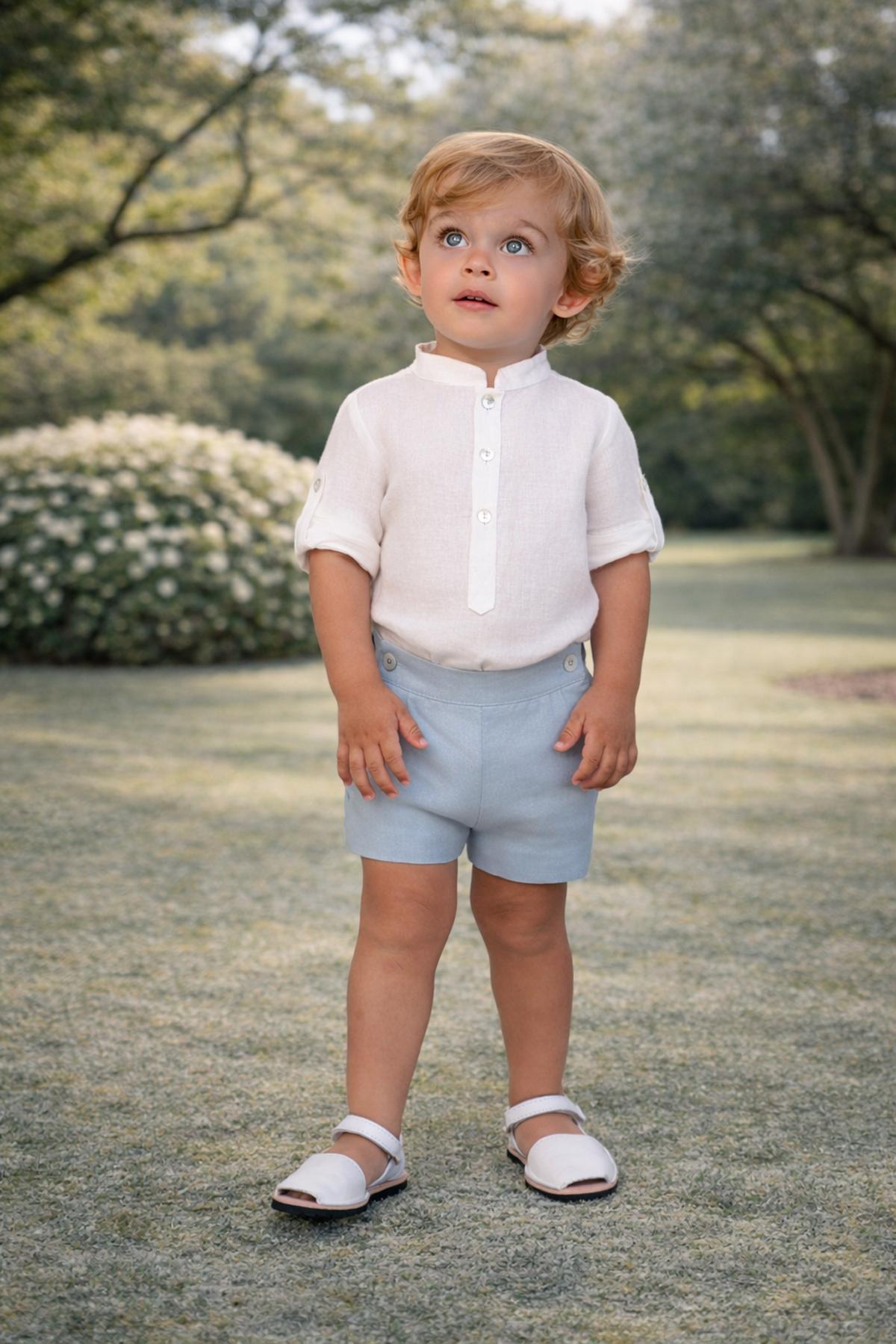 Precioso conjunto de niño de la nueva colección de ceremonia Nekenia para esta primavera verano, compuesto por pantalón corto de lino color celeste y camisa de manga larga cuello mao de lino. FABRICADO EN ESPAÑA.
