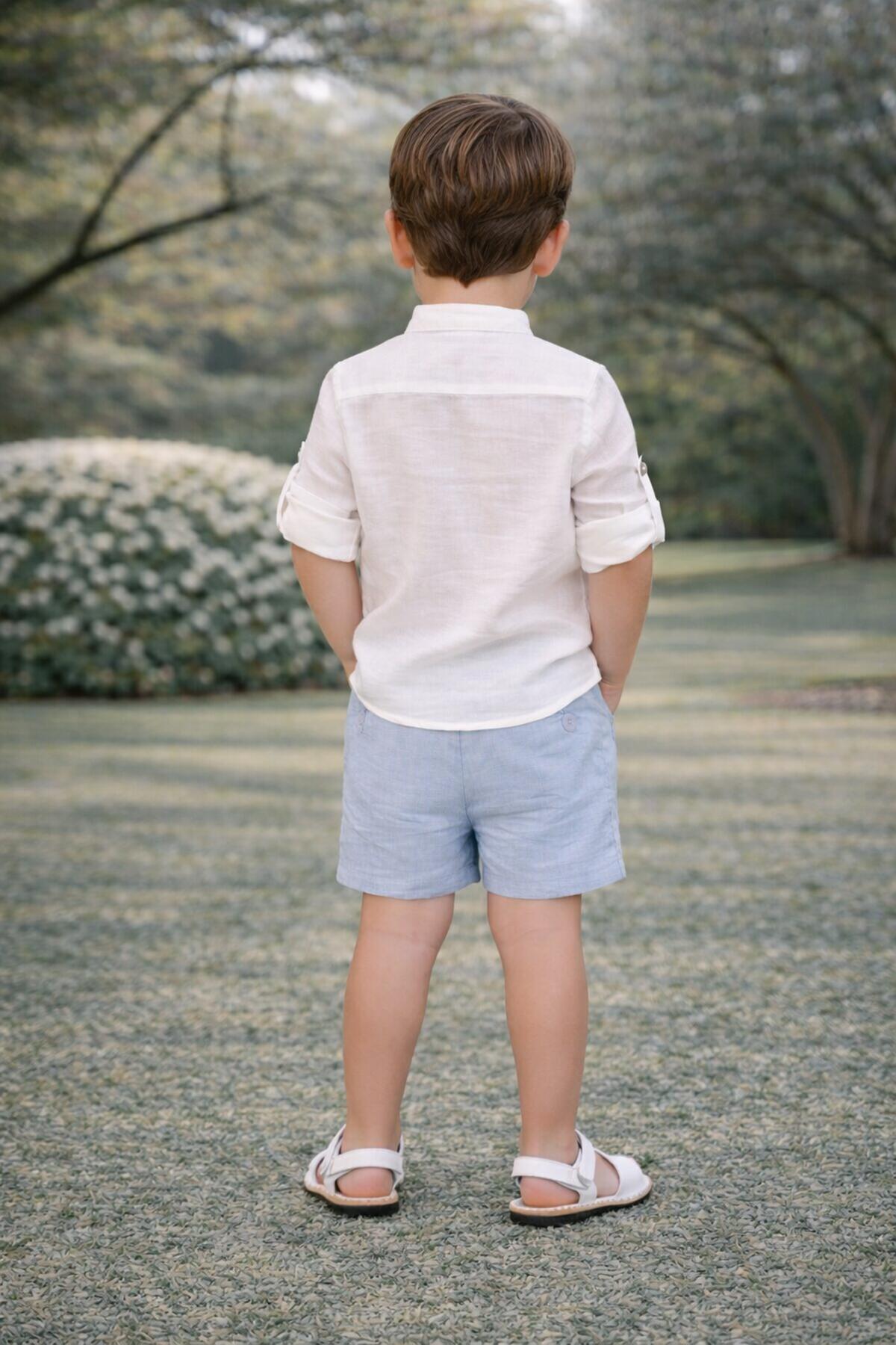 Precioso conjunto compuesto por camisa de manga larga de lino crudo con cuello mao que puede ser abierta entera o tipo polo y pantalón corto de vestidr confeccionado con lino de alta calidad de color celeste. Fabricado en España.