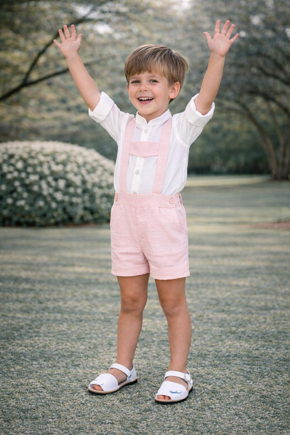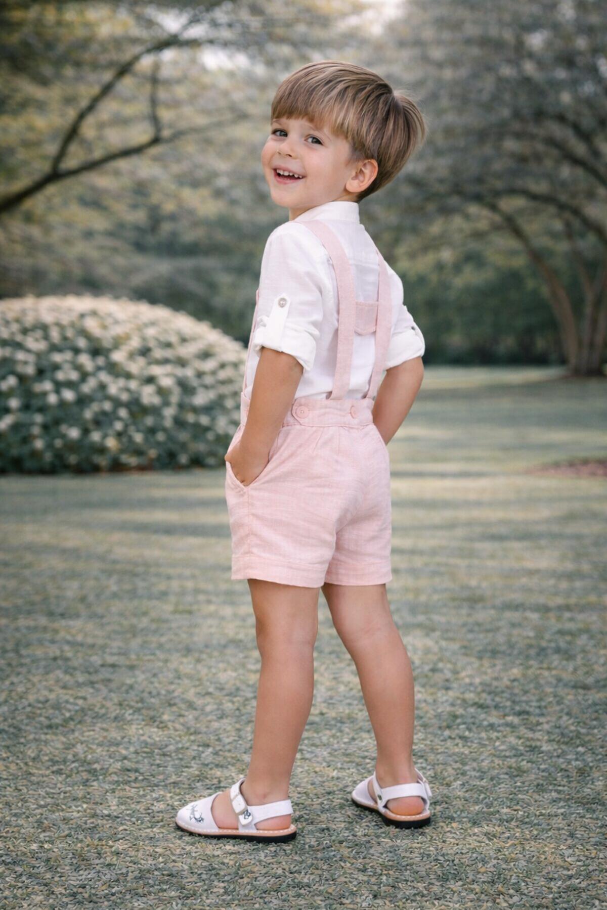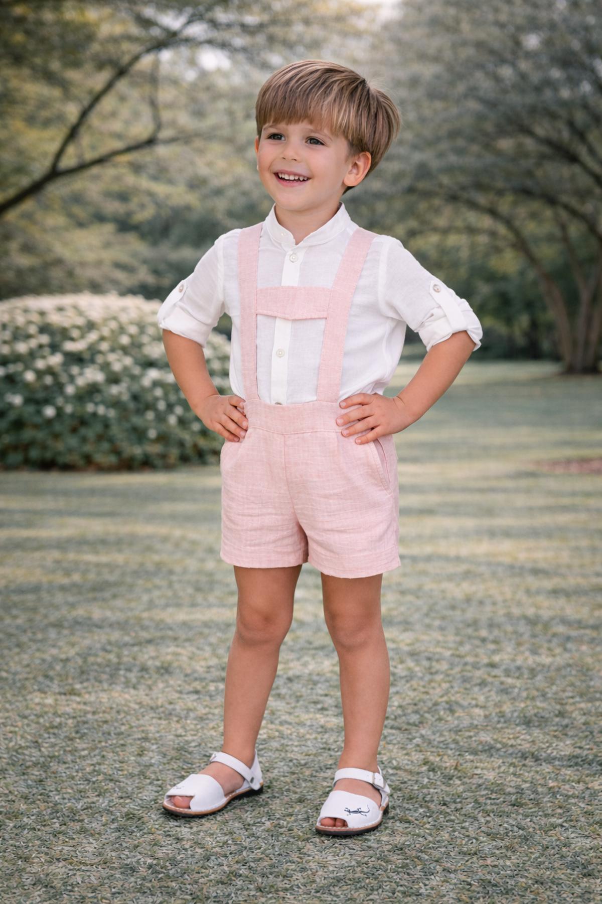 Precioso conjunto de bebe niño de la nueva colección de ceremonia Nekenia para esta primavera verano, compuesto por pantalón peto de lino color salmon y camisa de manga larga cuello mao de lino. FABRICADO EN ESPAÑA.
