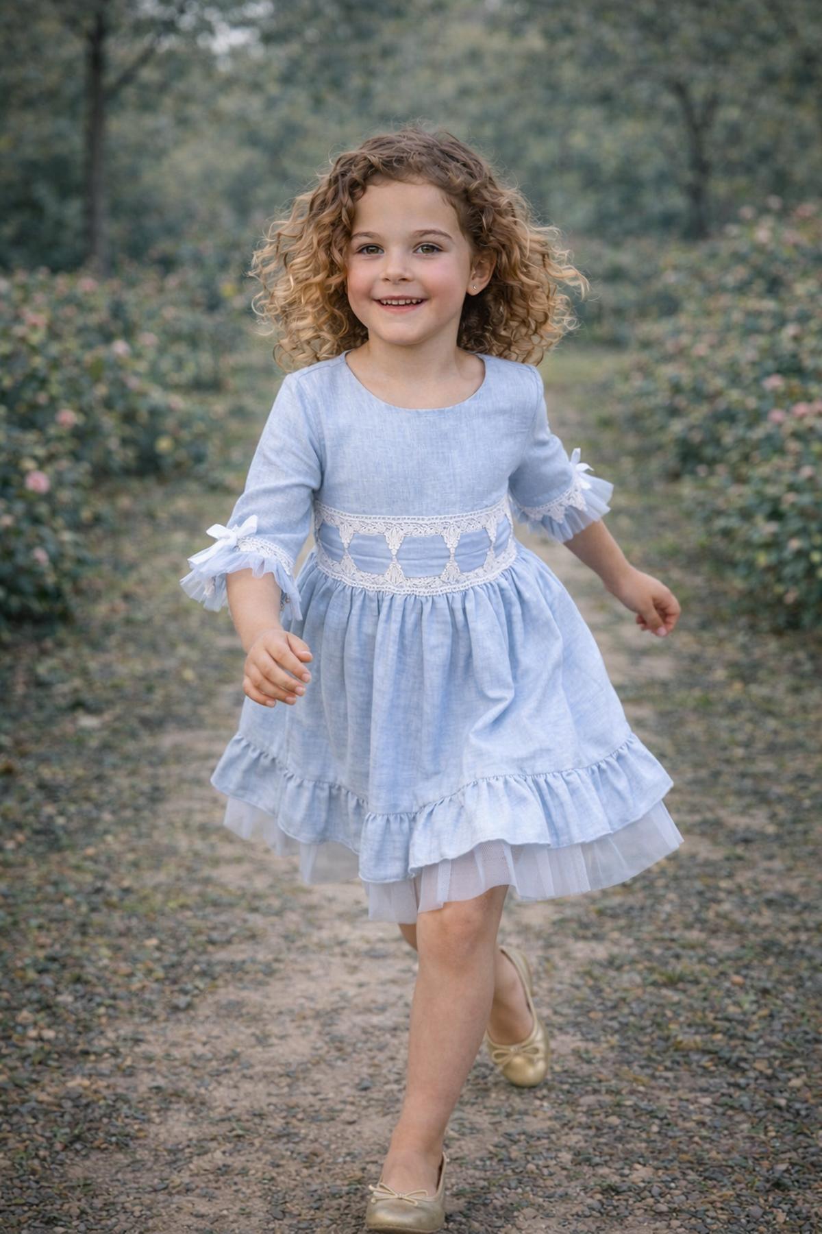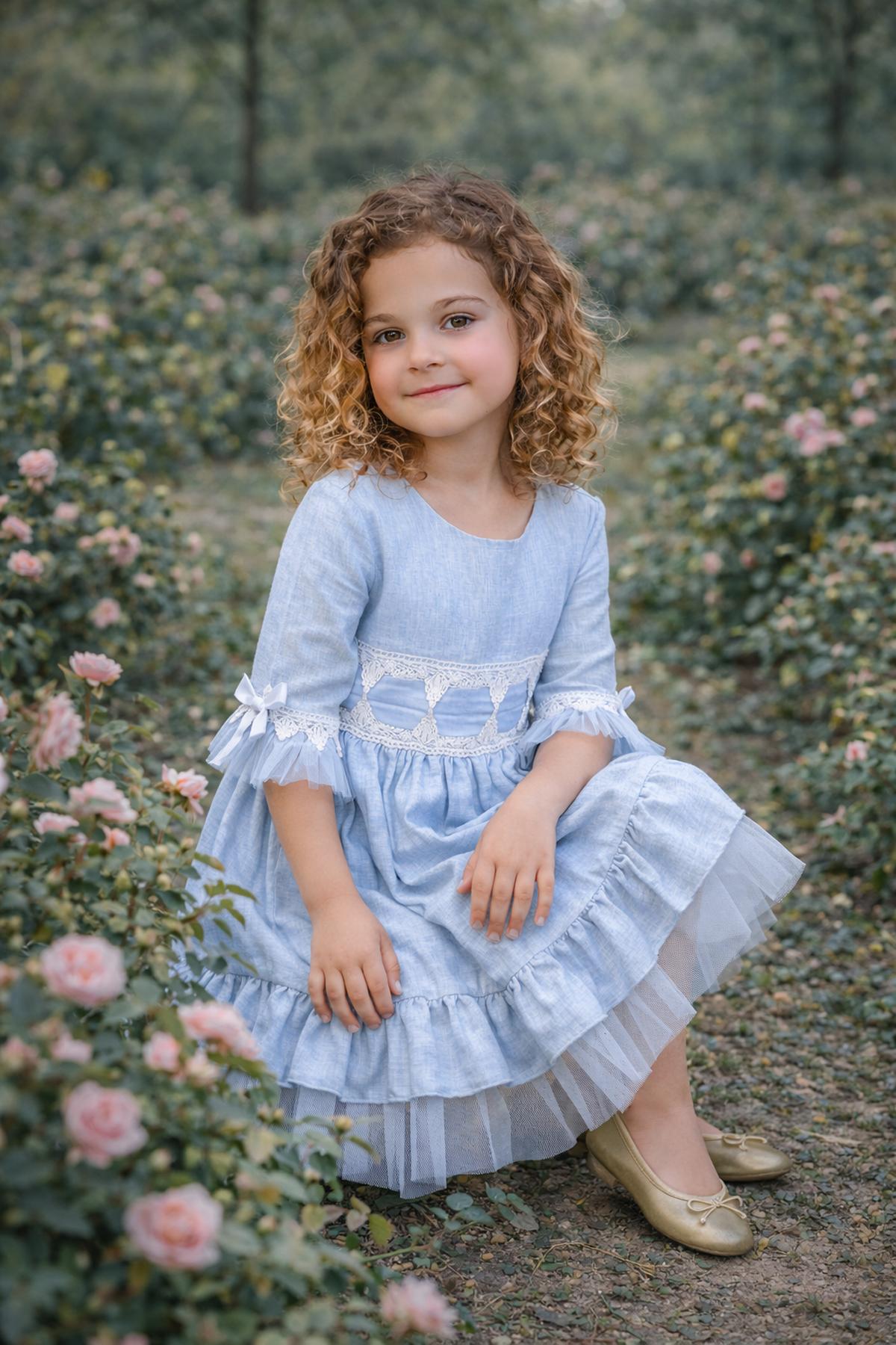 Nuevo vestido de ceremonia media manga para niña de la nueva colección de Nekenia para esta primavera verano, confeccionado en color azul con tul decorativo en cintura, bajo y mangas. FABRICADO EN ESPAÑA.