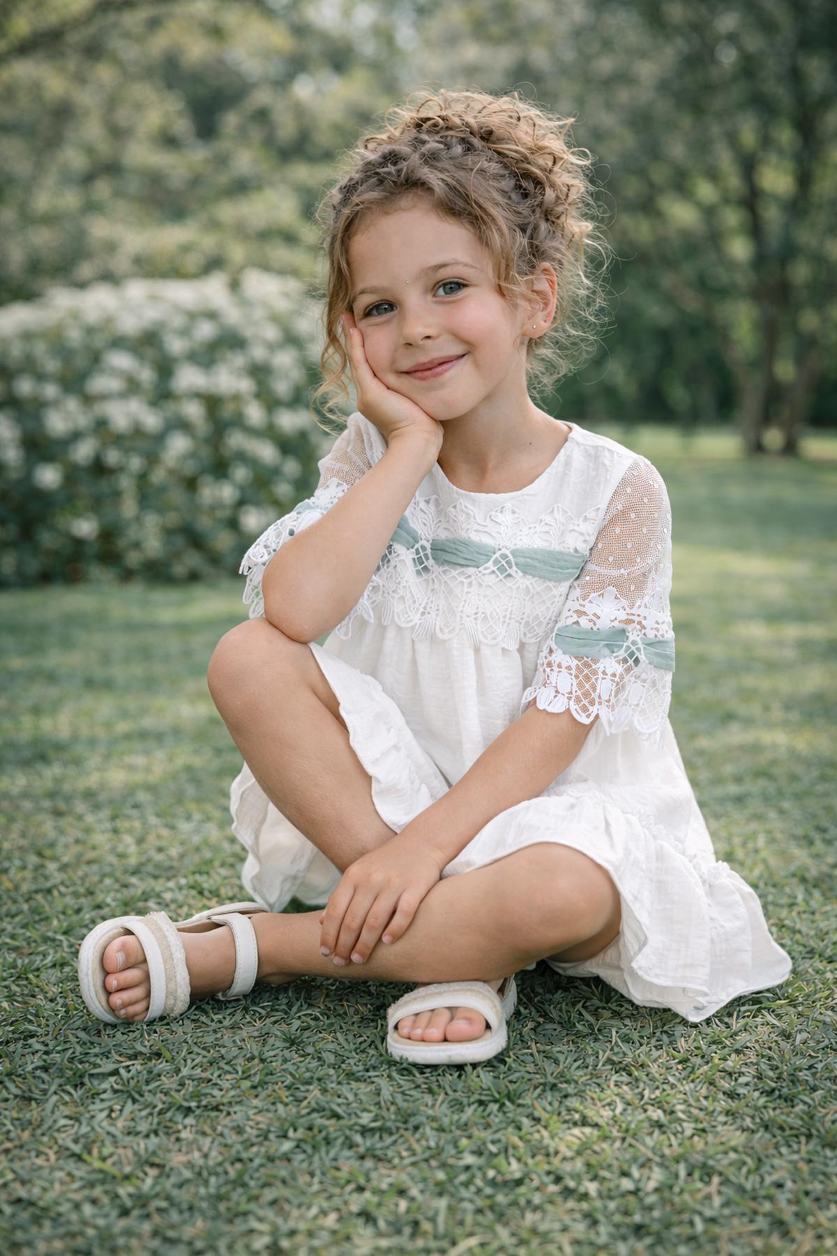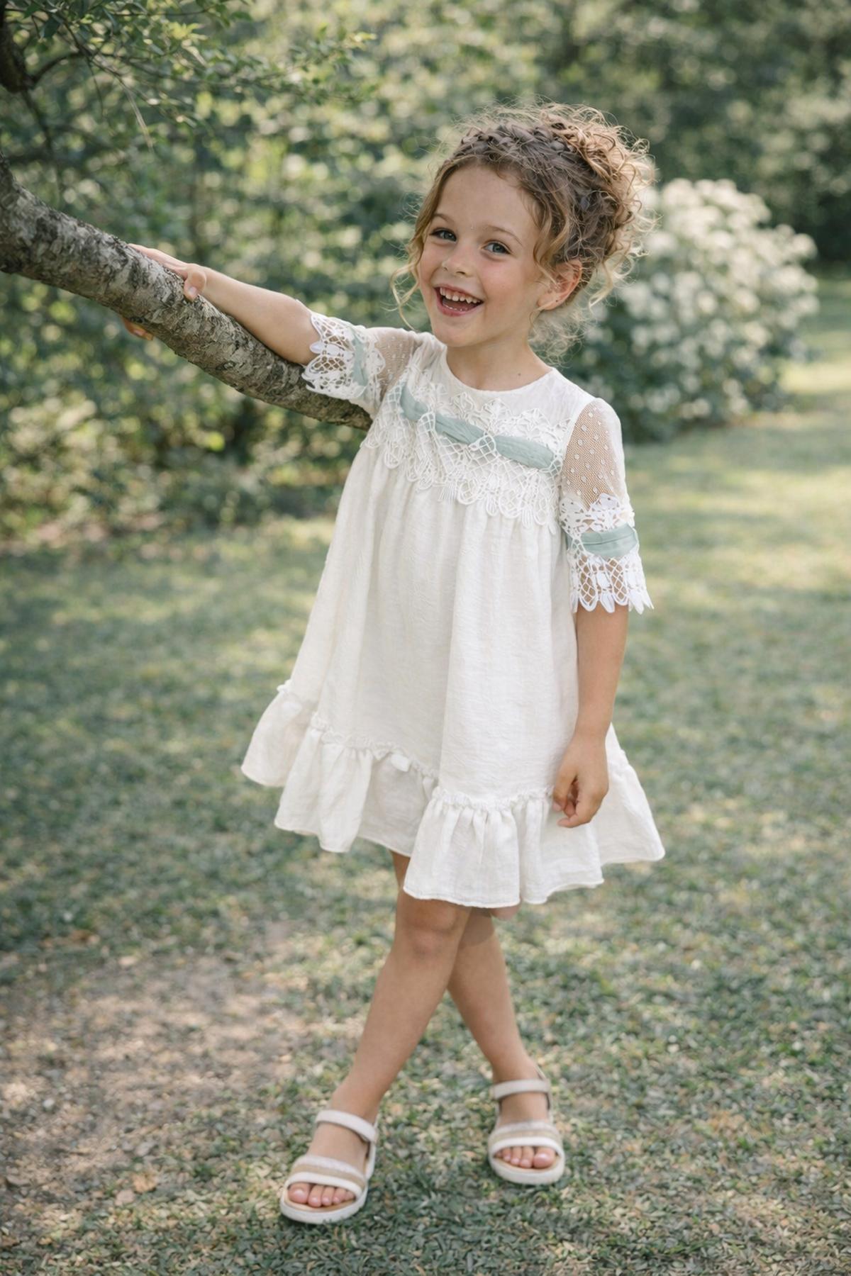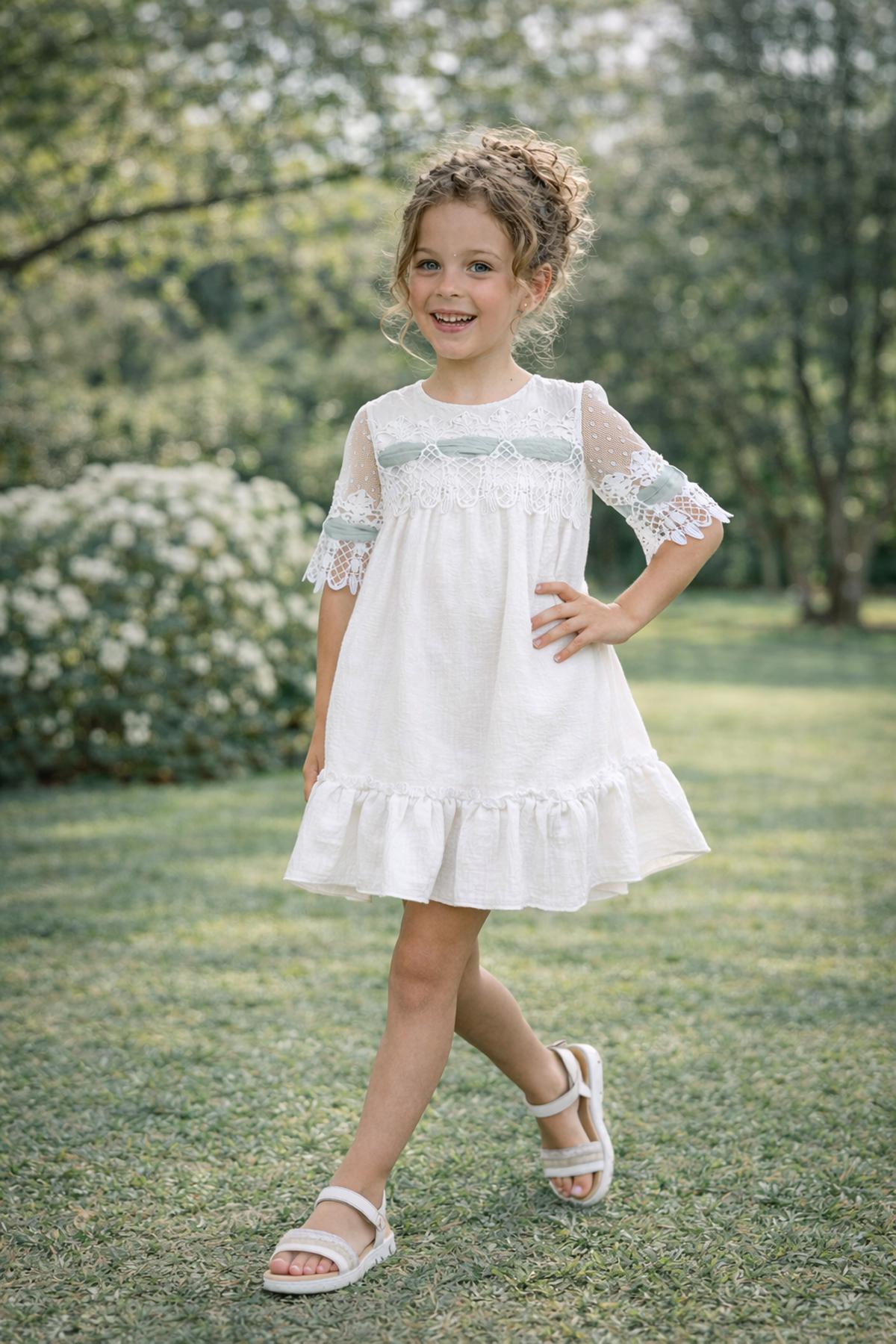 Nuevo vestido de ceremonia media manga de corte evase para niña de la nueva colección de Nekenia para esta primavera verano, confeccionado en blanco roto con diferentes tules decorativos en color verde agua, destaca por las blondas bordadas que tiene el pecho y mangas. FABRICADO EN ESPAÑA.