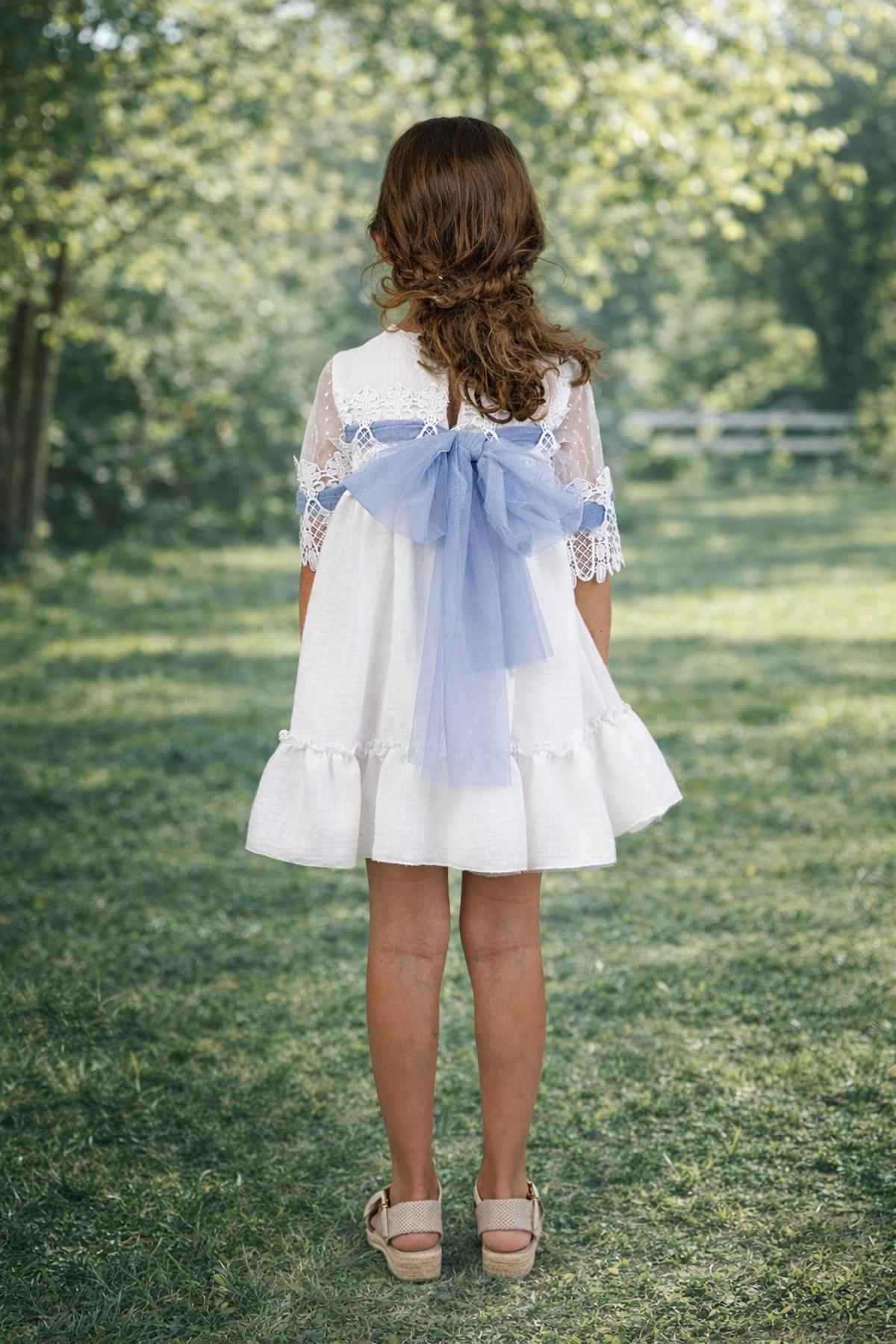 Nuevo vestido de ceremonia media manga de corte evase para niña de la nueva colección de Nekenia para esta primavera verano, confeccionado en blanco roto con diferentes tules decorativos en color azul, destaca por las blondas bordadas que tiene el pecho y mangas. FABRICADO EN ESPAÑA.