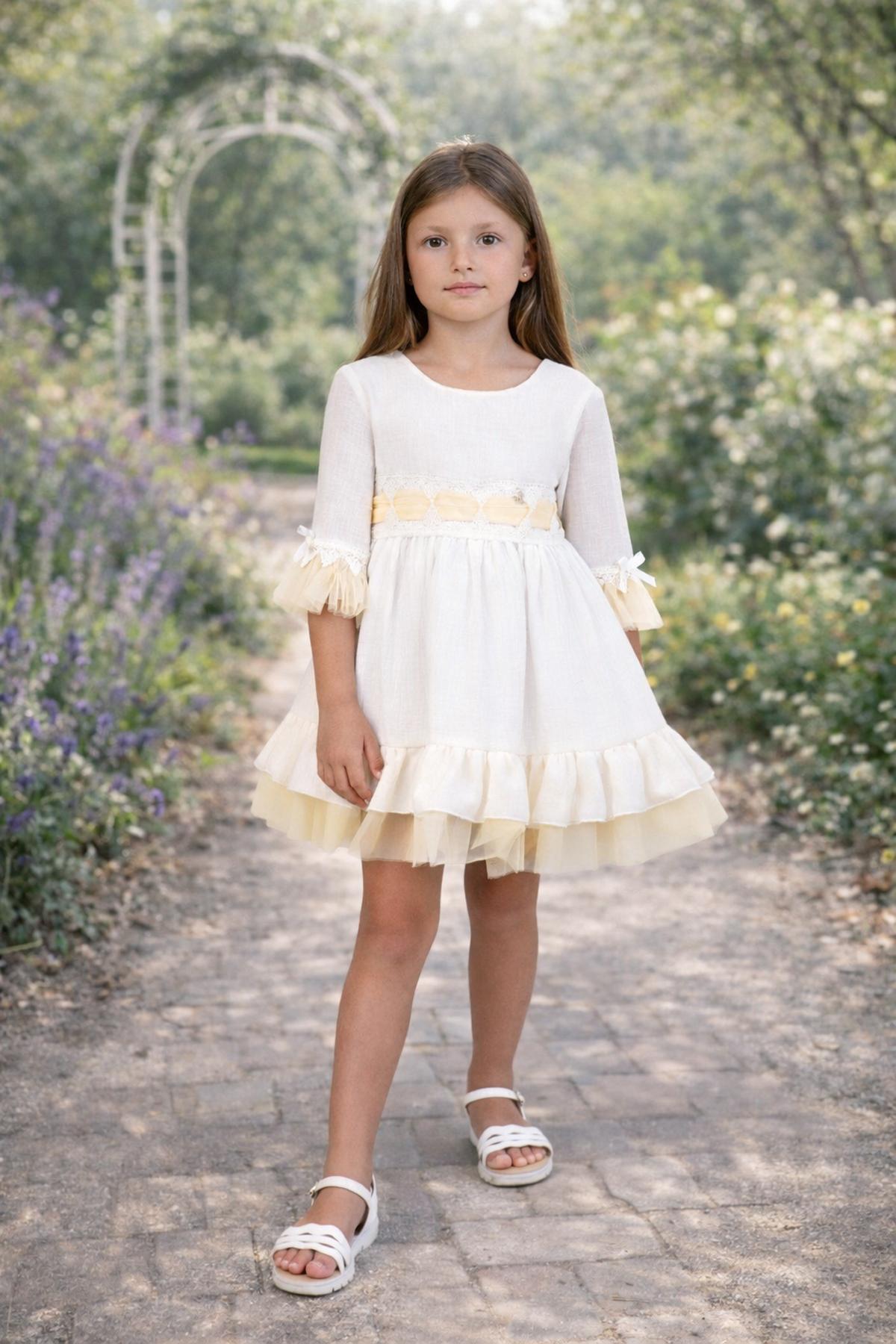 Nuevo vestido de ceremonia media manga para niña de la nueva colección de Nekenia para esta primavera verano, confeccionado en blanco roto con diferentes tules decorativos en color amarillo . FABRICADO EN ESPAÑA.
