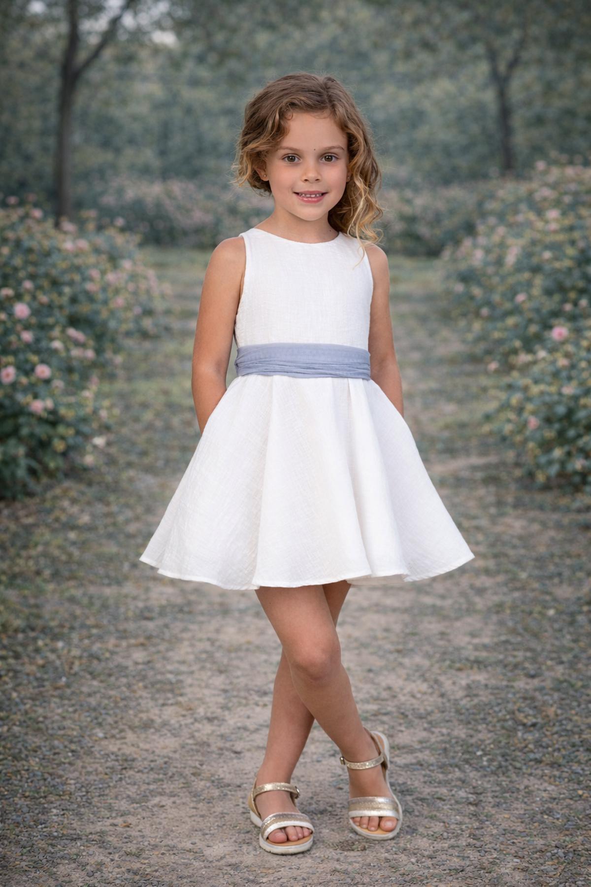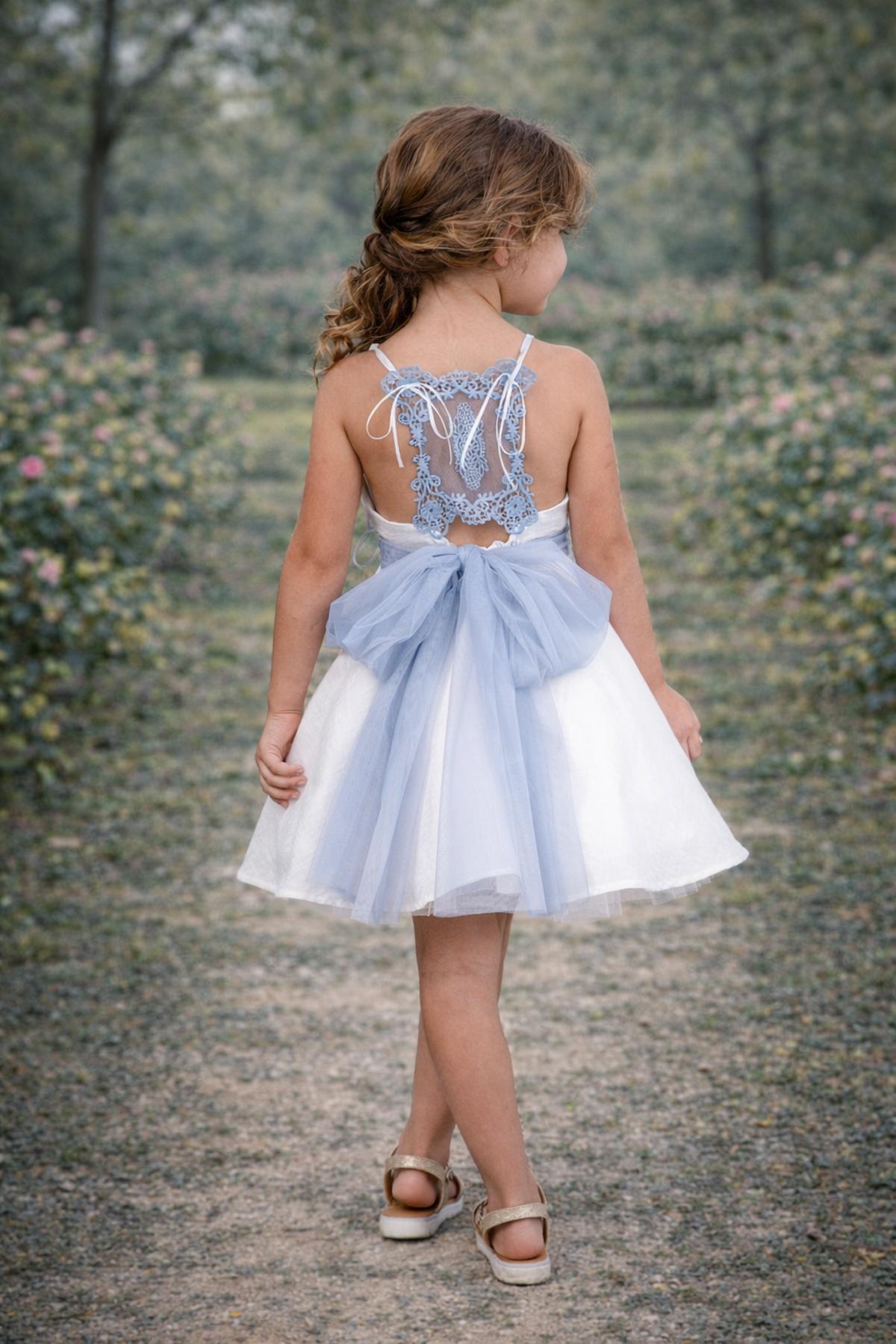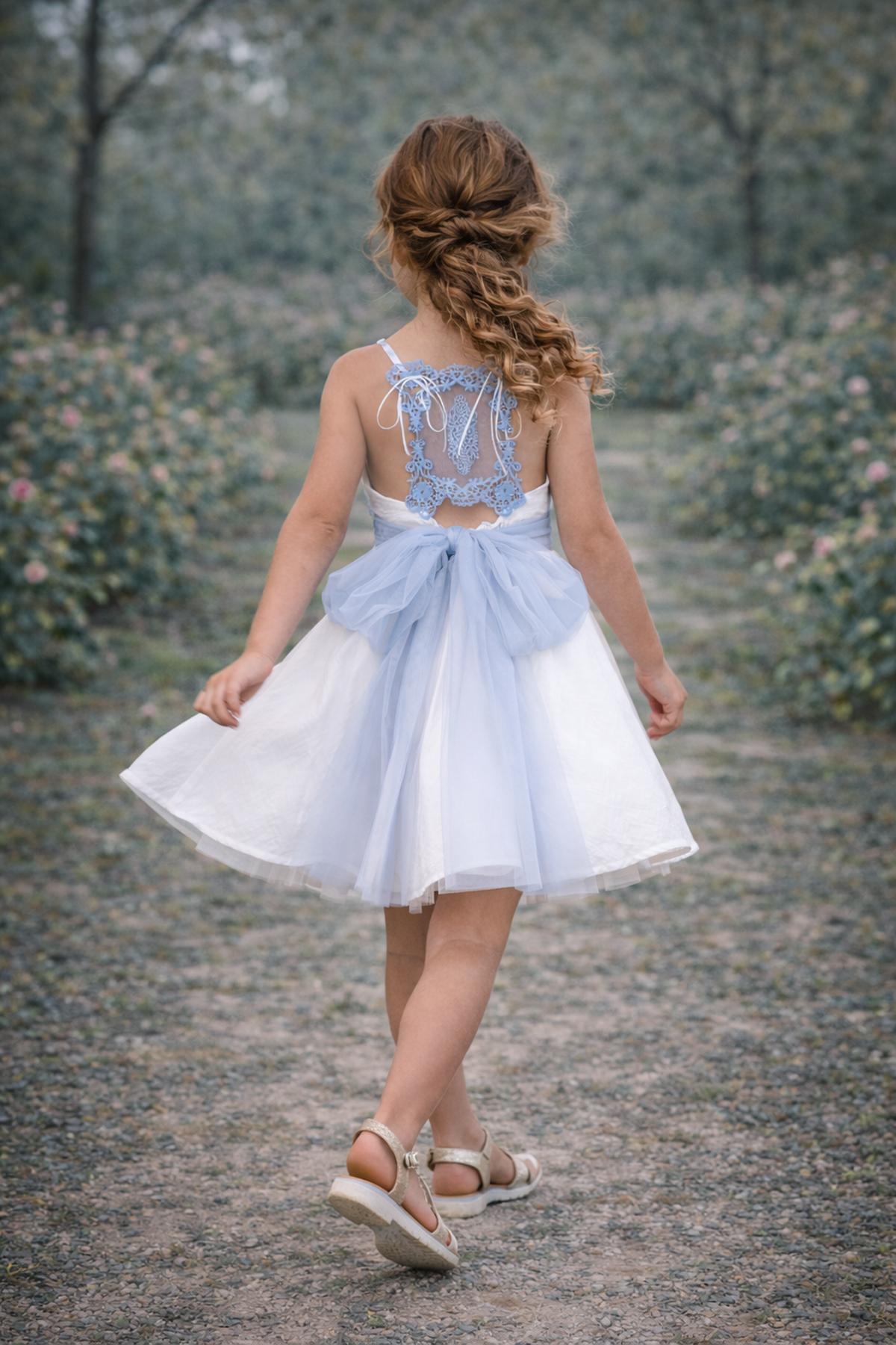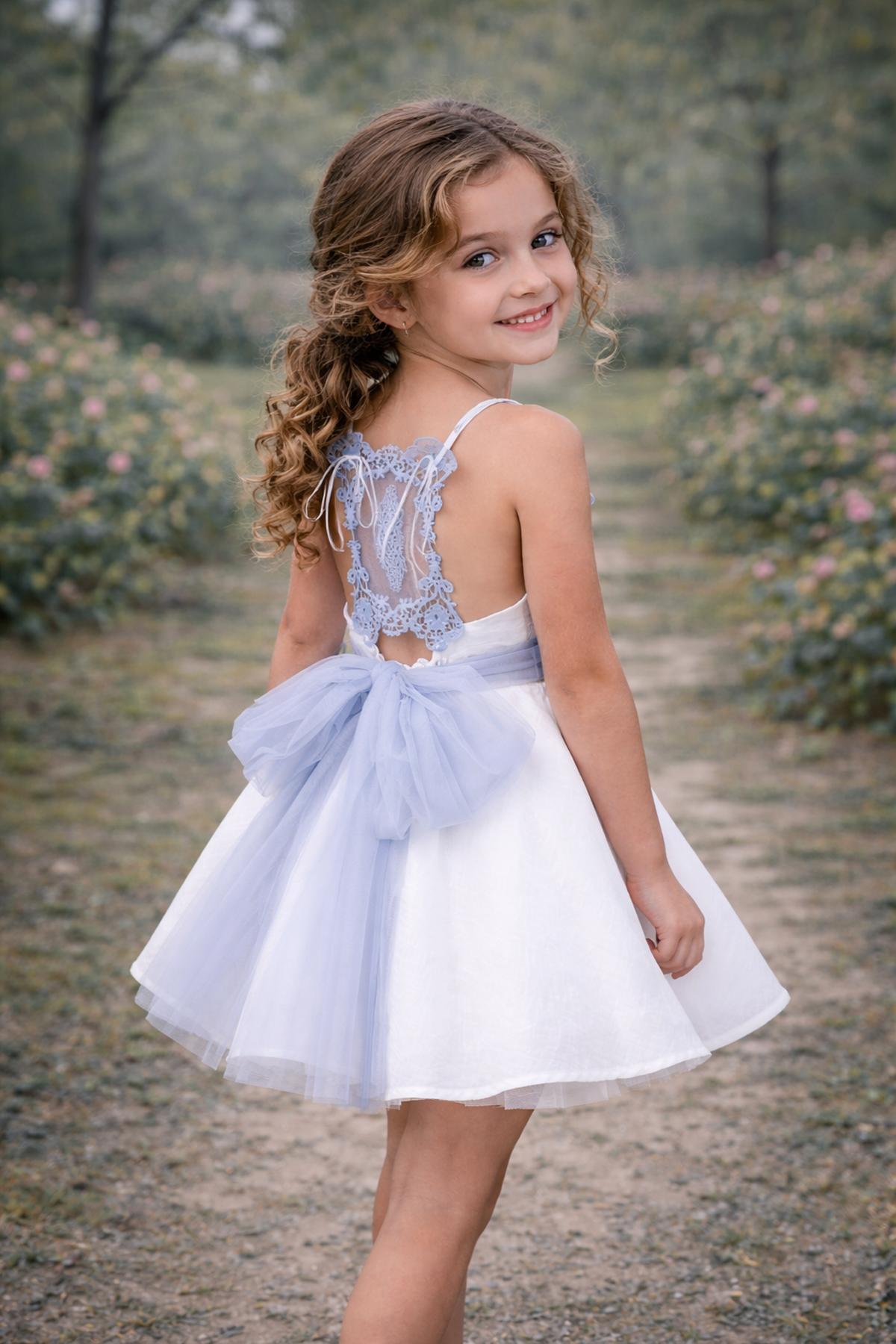 Nuevo vestido de ceremonia tirantes de talle bajo para niña de la nueva colección de Nekenia para esta primavera verano, confeccionado en blanco roto con fajín de tul en color azul donde destaca su preciosa espalda. FABRICADO EN ESPAÑA.