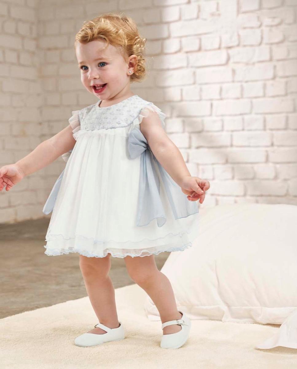 Espectacular vestido para bebe de ceremonia y bautizo, confeccionado en tul liso para la falda de varias capas donde destacan los pespuntes de la parte de abajo, el pecho esta bordado con pequeñas flores de color azul, también destaca por sus lazos de los laterales en bambula azul, va forrrado con varias capas y con fino cancan que le da un gran vuelo y volumen. Fabricado artesanalmente en España.