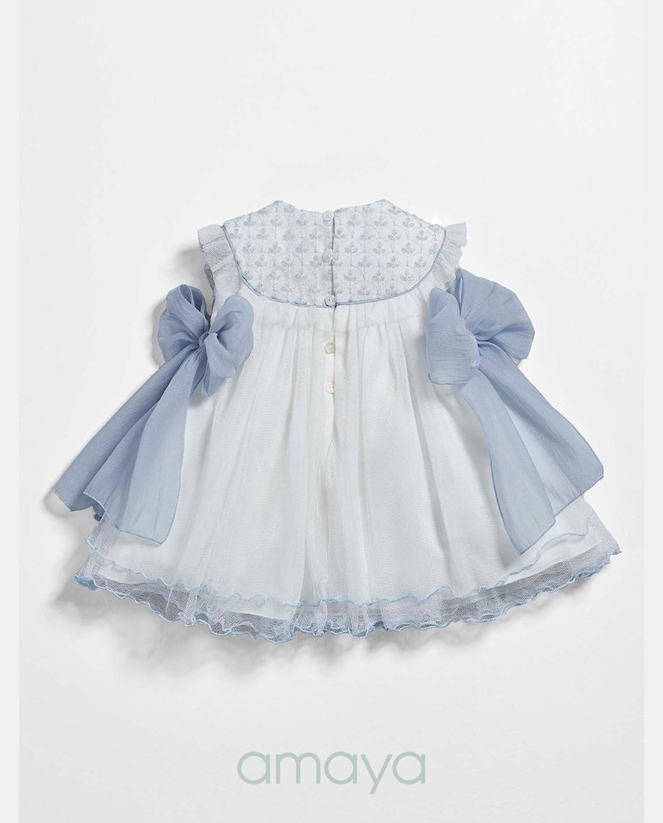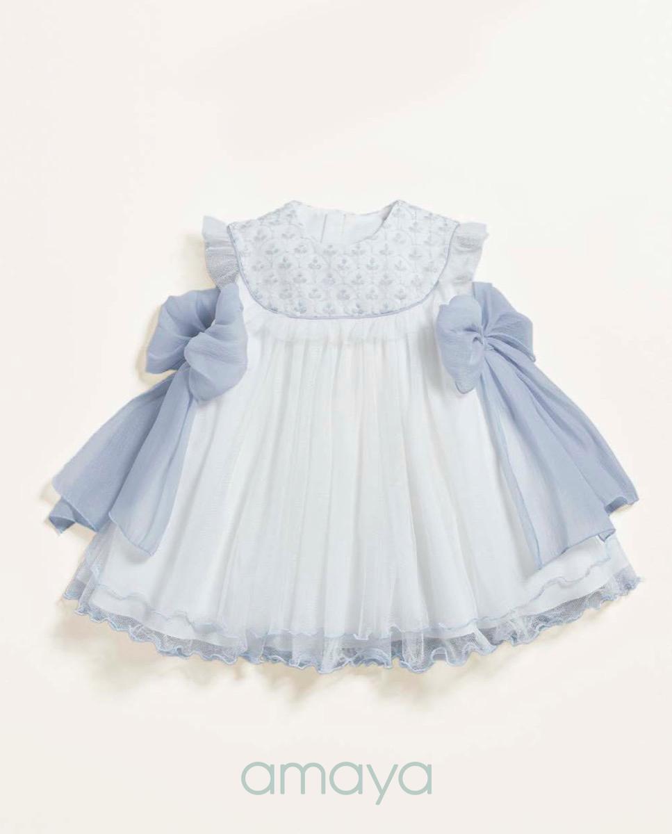 Nuevo vestido precioso de la colección de Bautizo para bebe niña de la marca premium Amaya, destaca por el pecho que va bordado en flores azules tanto por delante como por detrás, ademas la falda tiene varias capas de tul con pespuntes decorativos en el bajo en tono azul también. FABRICADO EN ESPAÑA.
