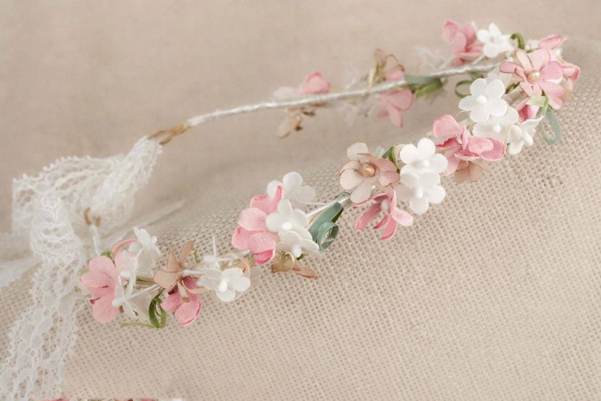 Espectacular corona de flores pequeñas para niña en tonos rosa, crudo y tostado , también tiene tira de blonda de encaje para ajustar la corona, complemento perfecto para los vestidos de Comunión y Ceremonia, fabricada artesanalmente en España. Viene presentada en bonita caja para regalo.
