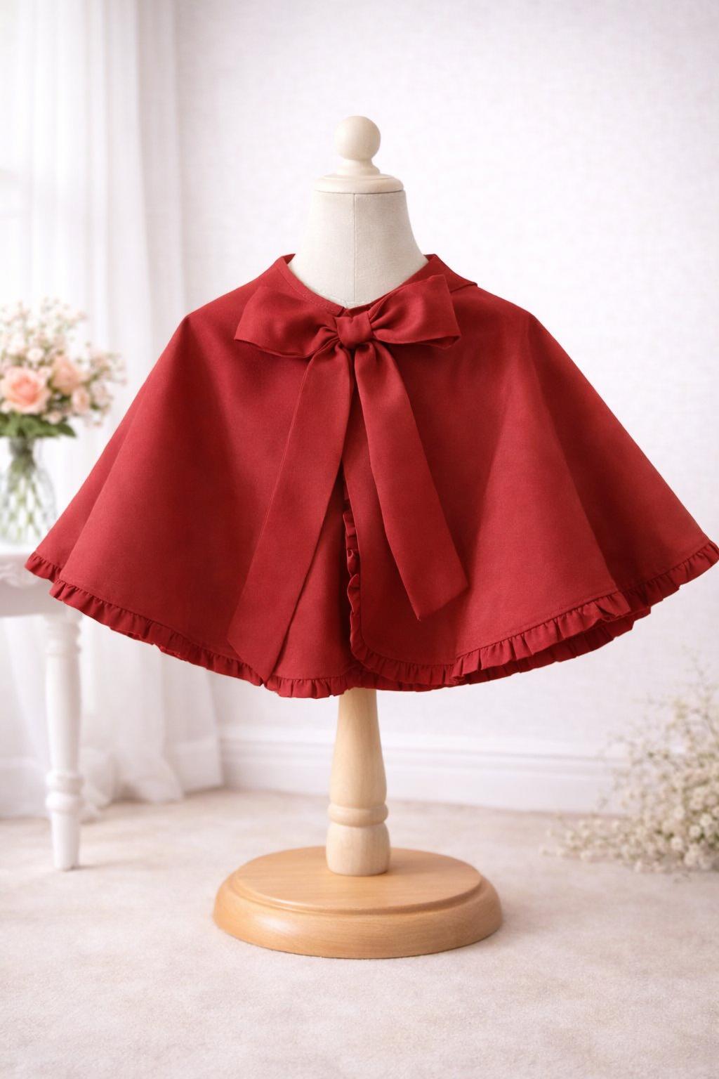 Preciosa capa de ceremonia y arras para niña de la firma española Eva Martinez Artesanía, confeccionada en sarga de alta calidad de color burdeos, va forrada y tiene contorno decorado con pequeñas tablas y una lazada en el cuello. FABRICADO EN ESPAÑA.